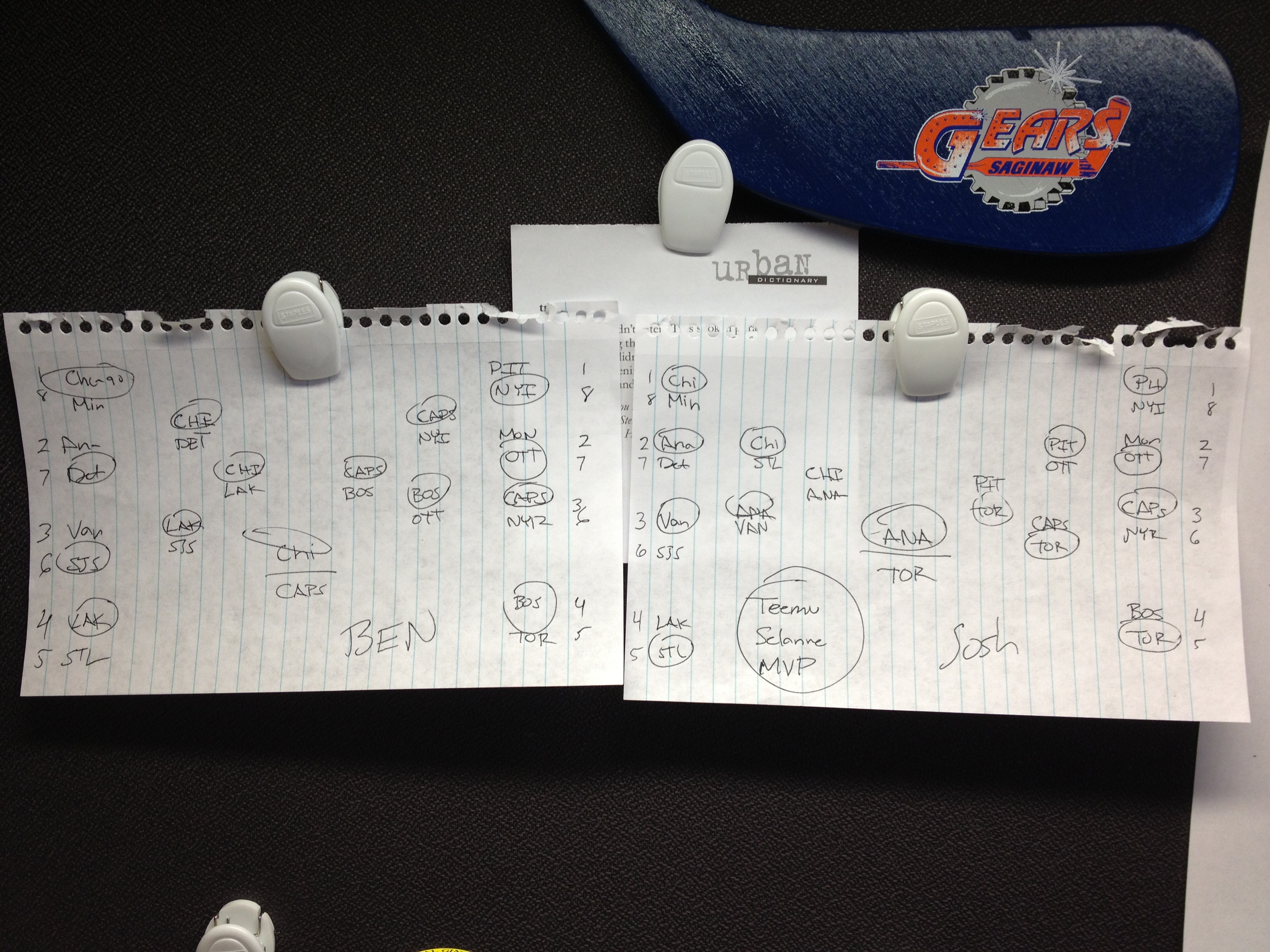So without further ado, here is my 2013 bracket for the Stanley Cup playoffs on the left. My co-worker’s bracket is on the right.