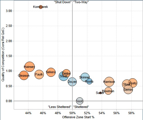 Considering the amount of top-tier skill Carolina now has, the power play unit was terrible for them last year. They were the fourth worst unit in the NHL and despite shooting at a league average rate, they had the worst shooting percentage with the man advantage. Considering that Muller came from the school of Jacques Martin, you would think the Hurricanes would be solid in some aspect on the penalty kill. Instead Carolina was dead last in shorthanded shooting rate and had the third worst penalty kill percentage.